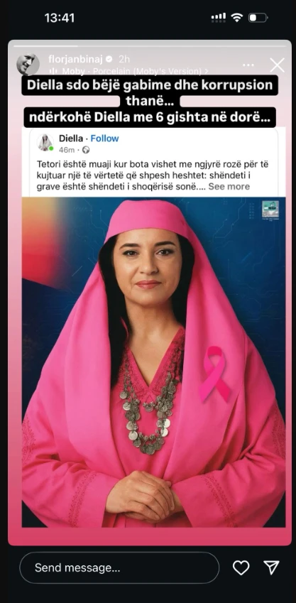 Ai zbuloi se Diella kishte plot gjashtë gishta në njërën dorë. Binaj shpërndau foton në InstaStory me ironi, duke shkruar: